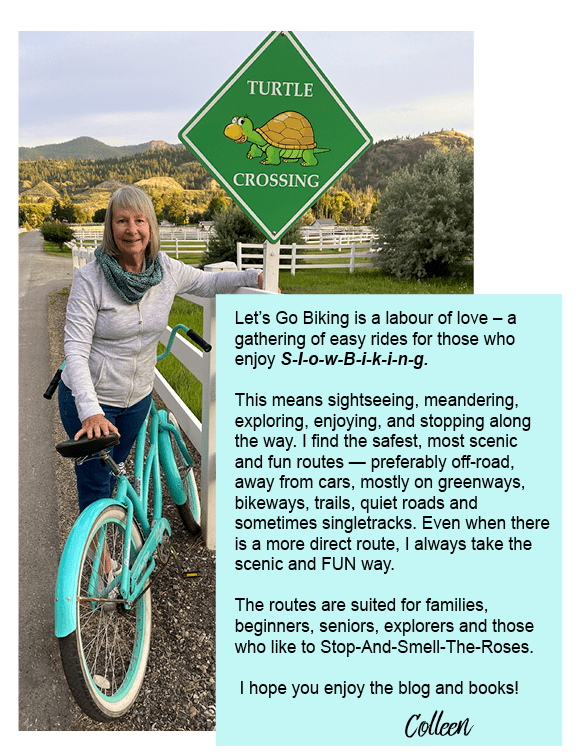 You can reach me at colleen@letsgobiking.net with questions, comments, ideas and photos.