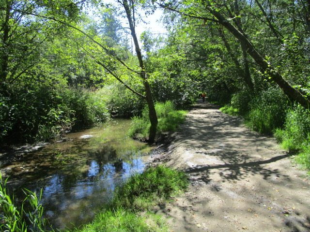 Trail Flooded: (2025) the trail on the west side of Cougar Creek is currently flooded and impassible by bike. Delta is working with DFO and other organizations to hopefully alleviate this issue and restore access soon. In the meantime, the best detour is the North Delta Greenway, high and dry on the east side of Cougar Creek.
