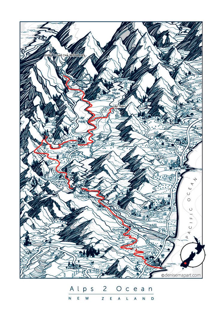 Visit artist Denise Nel to see wonderful handrawn maps highlighting the best walking and cycling trails in New Zealand.