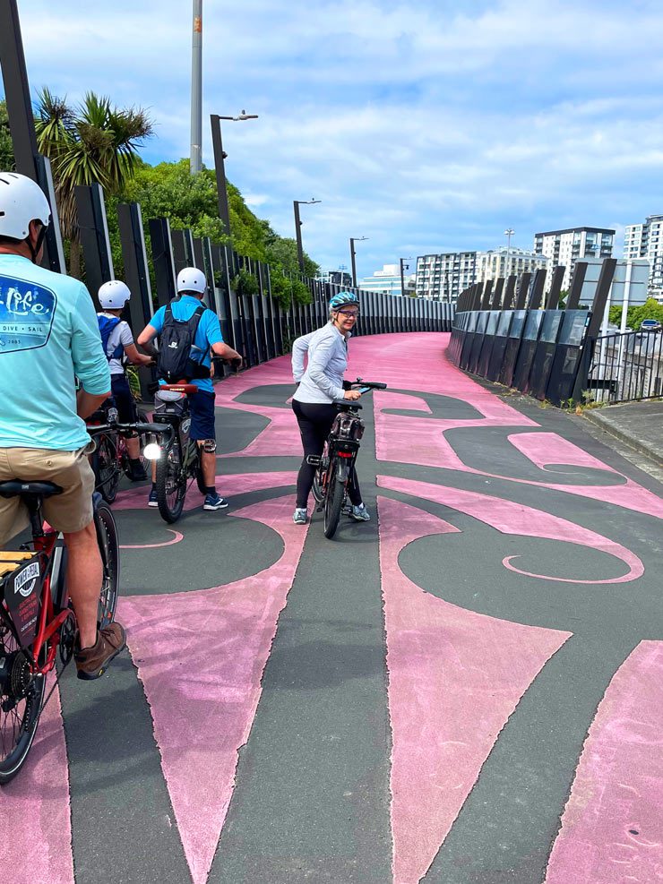 Our guide led us along the Light Path, a bright pink elevated bikeway that has become one of Auckland’s signature cycling experiences. From there we wove through quiet neighbourhoods, leafy parks, and vibrant streets. It is the kind of local perspective we love — seeing how residents live, and discovering areas we never would have found on our own.